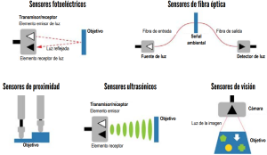 Los sensores pueden incluirse en algunas categorías diferentes, como de fibra óptica, de proximidad, ultrasónicos, optoelectrónicos y de visión. Estos sensores se utilizan en celdas de trabajo para reunir datos con fines de inspección o para activar otros dispositivos durante la producción.